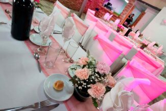 - MESA CON MANTEL BLANCO Y CAMINO DE COLOR